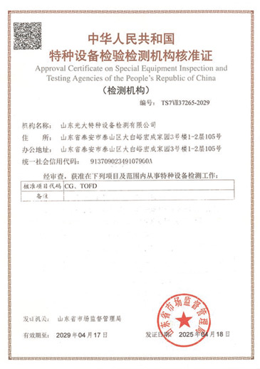 山東光大特種設備檢測有限公司是經(jīng)山東省市場監(jiān)督管理局核準的甲類B1特種設備綜合檢驗機構。2017年9月30日取得了山東省市場監(jiān)督管理局頒發(fā)的《檢驗檢測機構資質(zhì)認定證書》。2018年2月22日取得了山東省市場監(jiān)督管理局頒發(fā)的《特種設備檢驗檢測機構核準證》(起重機械)檢驗檢測資質(zhì)。2021年11月取得山東省市場監(jiān)督管理局版發(fā)的《特種設備檢驗檢測機構核準證》(安全閥在線、離線)校驗資質(zhì)。2023年11月取得山東省市場監(jiān)督管理局頒發(fā)的甲類檢驗機構B1《特種設備檢驗檢測機構核準證》,具有壓力容器(RD2...